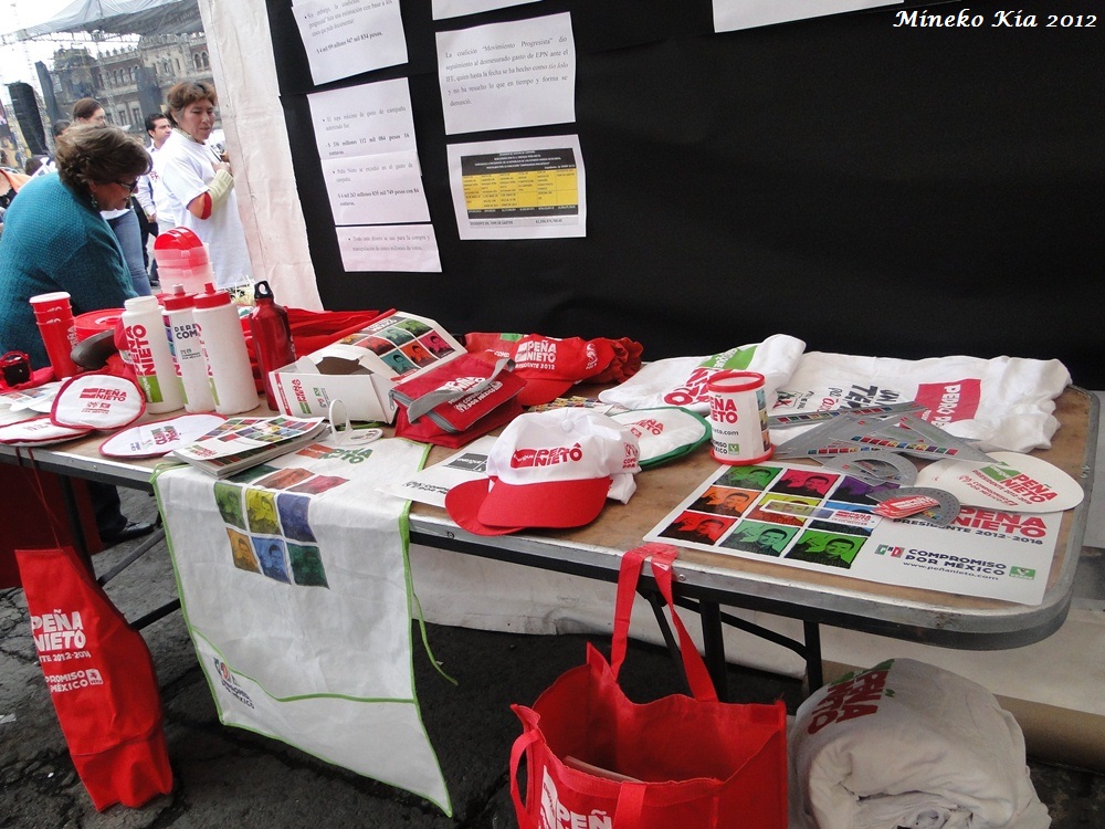 Mandiles, cachuchas, plumas, juegos de geometría, linternas, parrillas eléctricas, comales, brillos labiales, películas en DVD's, USB's, bolsas para el mandado, las famosas tarjetas Soriana y Monex, tarjetas telefónicas, una cafetera que fue regalada de parte del SNTE diciendo que era "de-parte-de-Peña-Nieto", termos, Peña-lindros, vasos, sombrillas, diccionarios 'básicos', computadoras, botiquines, propaganda en contra de AMLO que se repartía por las noches (en el estado de Hidalgo), mochilas, encendedores... ¡¡¡uffff!!!... evidencia que, por supuesto, "no se ve": no la ve el IFE, ni el TRIFE y también (desafortunadamente) mexicanos que todavía no alcanzan a comprender que esta elección comprada no afecta directamente a AMLO, ni a su supuesta "ambición de poder", sino a la democracia de nuestra nación.